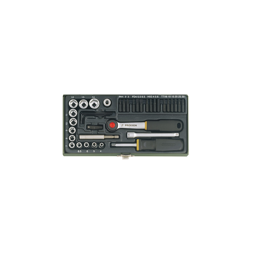 Proxxon Industrial 23070 je 39 djelna garnitura odvijača i nasadnih ključeva sa 1/4″ magnetnim držačem bit nastavaka.